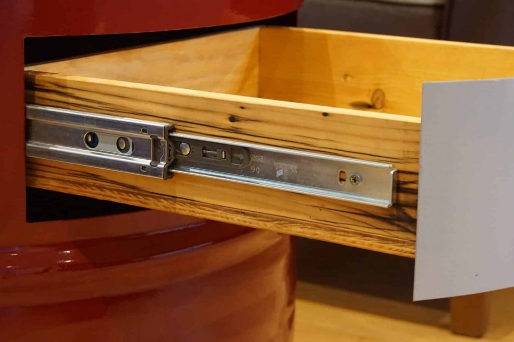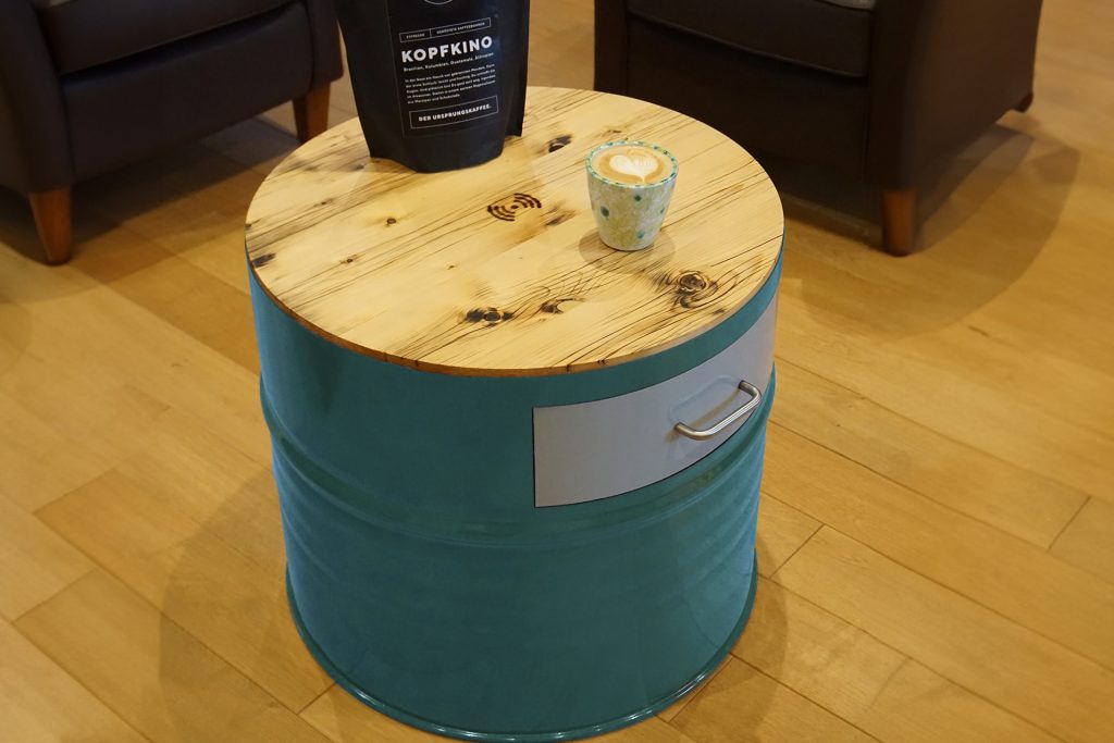 Kernstück des Möbels ist die praktische Schublade, die Stauraum für Alltagsgegenstände bietet und die Oberfläche frei hält. Sie fügt sich perfekt in das Fass ein und zeichent sich dadurch aus, dass das Ölfass im geschlossenen Zustand kaum verändert ist. Öffen und Schließen wird über einen Edelstahlgriff erleichtert, hochwertige Auszüge mit Soft-Close-System runden das ganze Feature in hoher Qualität ab.